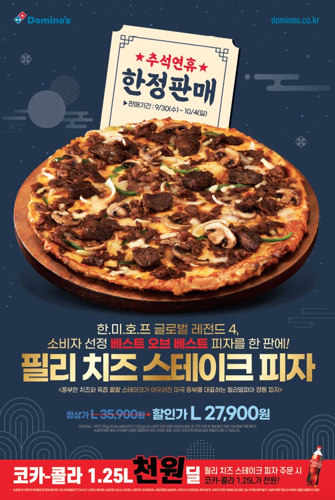 도미노피자는 지난 24일까지 글로벌 4개국 베스트 피자로 구성 된 가을 신제품 ‘글로벌 레전드4 피자’ 중 가장 먹고 싶은 피자를 선정하는 이벤트를 진행했다. 투표 결과 가장 많은 득표수를 얻은 ‘필리 치즈 스테이크 피자’를 추석 연휴 기간 동안 한정 판매할 예정이다.