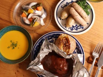 「つばめ風ハンブルグステーキ&北海道産かぼちゃのポタージュスープセット」に、「自家製ソーセージ」と「ニシンの酢漬け」の前菜が付いたディナーセットです。