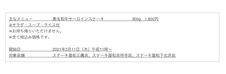 このたび松屋フーズ(本社:東京都武蔵野市、代表取締役社長:瓦葺一利)では、ステーキ専門店『ステーキ屋 松』におきまして、2021年2月11日(木)午前11時より「黒毛和牛サーロイン300g」を発売いたします。