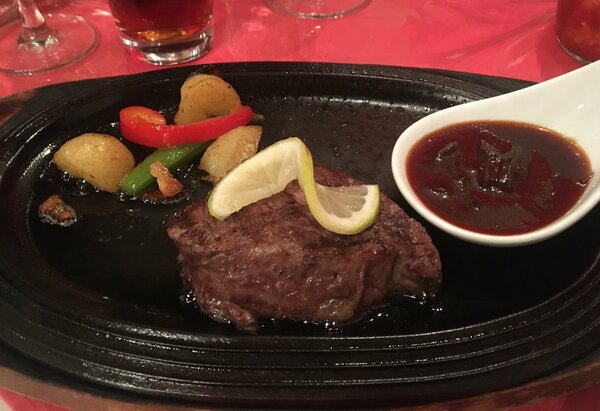 閉店の時期は未定だが、12月いっぱいは営業する予定とのこと。ヒレ肉の中央にある最高級部位、シャトーブリアンのステーキは食べたことがない。ボーナス前ということもあり、ぜひ味わってみたいと思い切って注文した。従来は200~250グラムで注文する人が多いとのことだが、半額サービスを始めてからは「より多くの人に提供するために」と、1人100グラムとしている。