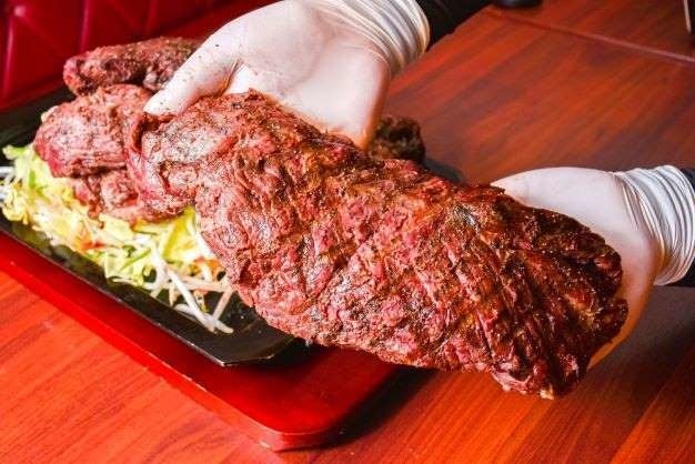 柔らかヘルシーなブ厚いハラミ肉をこれでもかと積み上げた『ステーキロッヂ 渋谷宇田川店・池袋店』限定メガ盛りメニュー。