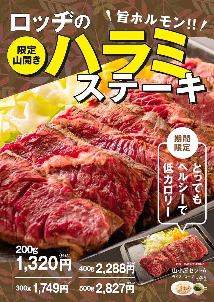 『ステーキロッヂ』渋谷宇田川店・池袋店では、200g~500gの通常サイズの「ハラミステーキ」も期間限定でご提供中です。
