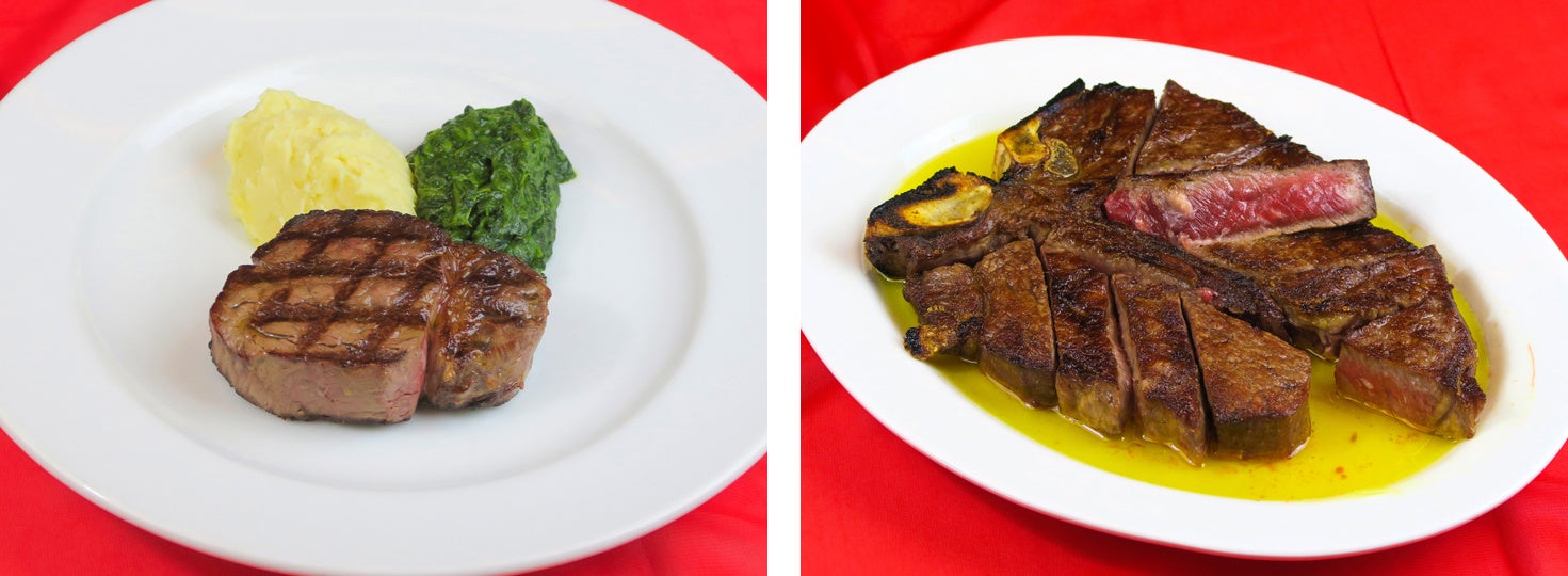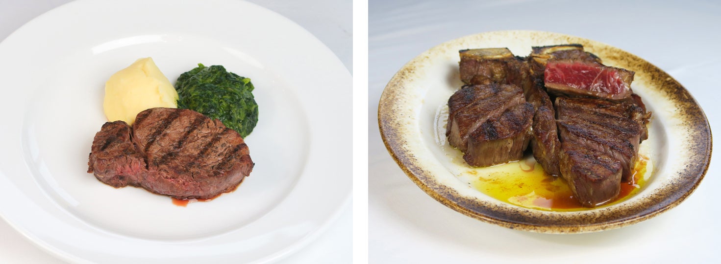 【Main】USDAプライム フィレミニョン マッシュポテトとクリームレス・クリームスピナッチ添え (左)、または USDAプライム ポーターハウス マッシュポテトとクリームレス・クリームスピナッチ添え(右、2名様より)