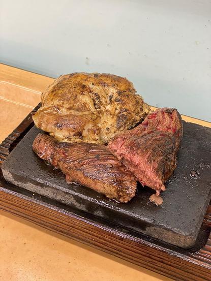 スタンダートメニュー(1,100円)は牛赤身、牛フィレ、牛ハラミ、牛ロース、トンテキ、チキンステーキの6種類を用意。いずれも素早く提供され、石焼きのプレートに乗せられるので、自分好みの焼き具合に調整することができる。