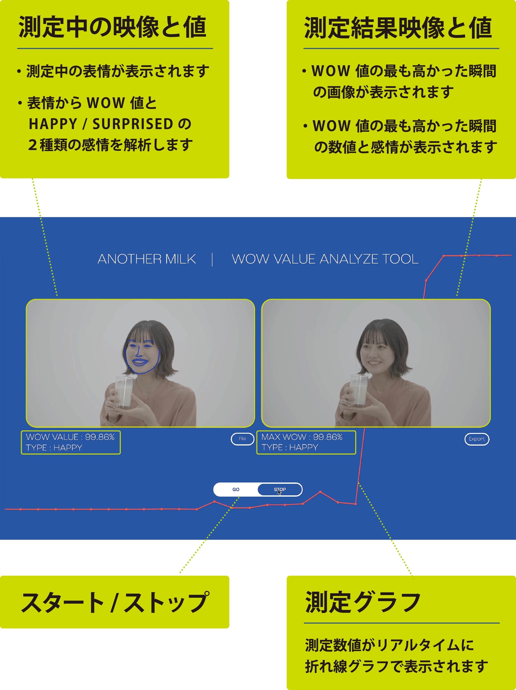 「WOW値分析ツール」は、動画に映る人物の表情を感情認識AIで分析するWebアプリケーションです。これまで、人間の驚きや嬉しさなどの感情は、表情から感覚的に感じ取ることができても、客観的な指標で測定することが難しいとされてきました。そこで、「WOW値分析ツール」は初めてパスチャライズド牛乳を飲んだときの“WOW”の度合いを客観的な指標で測定することで、言葉やアンケートだけでは表すことのできない無意識の感情を捉えることを目的に開発しました。